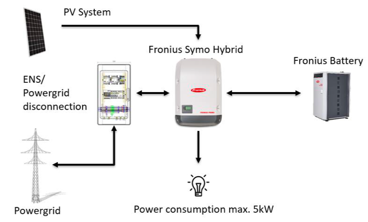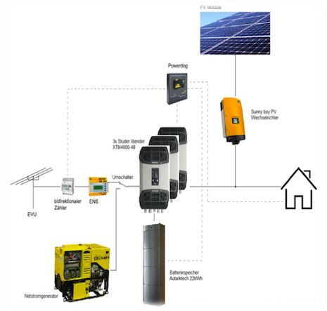 The simplest and most cost-effective storage concept which includes emergency power supply for domestic electrical consumers. In the event of a power failure, the house connection is disconnected and the stored solar energy from the batteries is used. This system is particularly quick and space-saving to install. The system works completely automated and takes over balancing charges at regular intervals to guarantee a long lifetime of the batteries. The emergency power operation is particularly suitable for smaller and preferably ohmic loads such as light, stove and chargers.